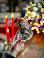 Filled with patchouli, mullein, rose, cayenne, lavender, safflower, chrysanthemum, chamomile, blue apatite, black tourmaline, moss agate, obsidian, wolf shed and a butterfly wing.