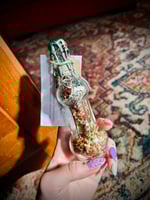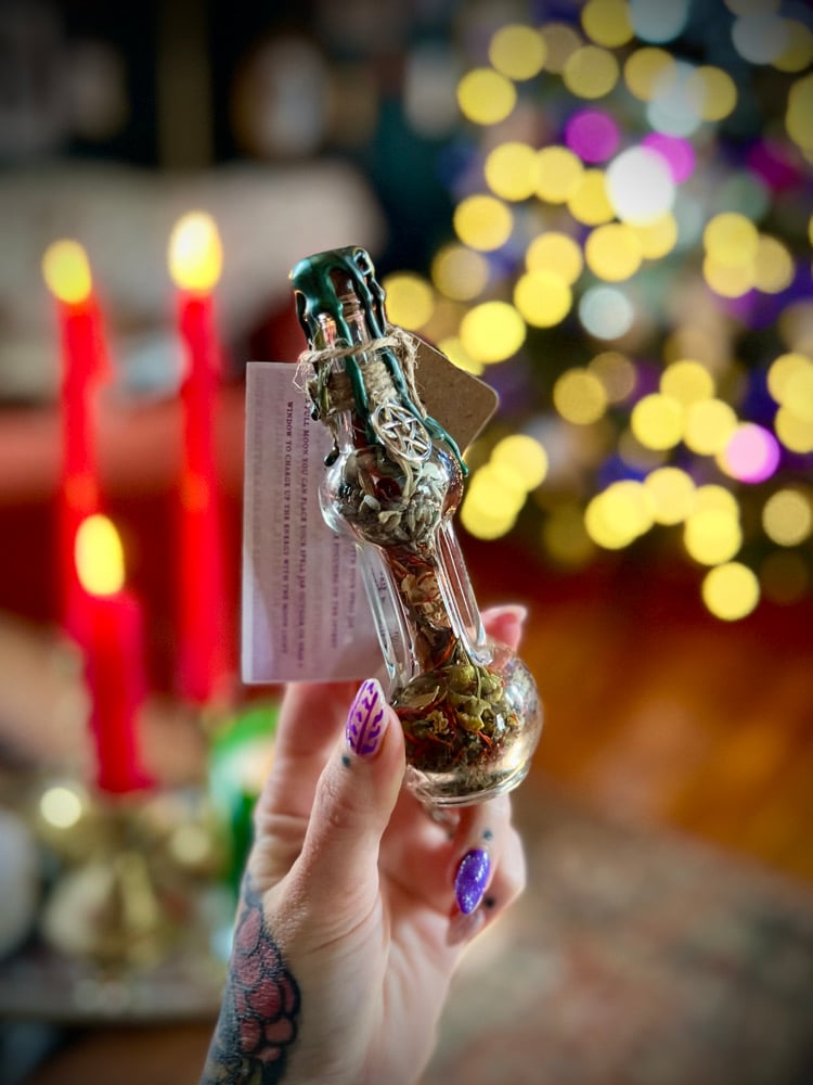 Filled with patchouli, mullein, rose, cayenne, lavender, safflower, chrysanthemum, chamomile, blue apatite, black tourmaline, moss agate, obsidian, wolf shed and a butterfly wing.