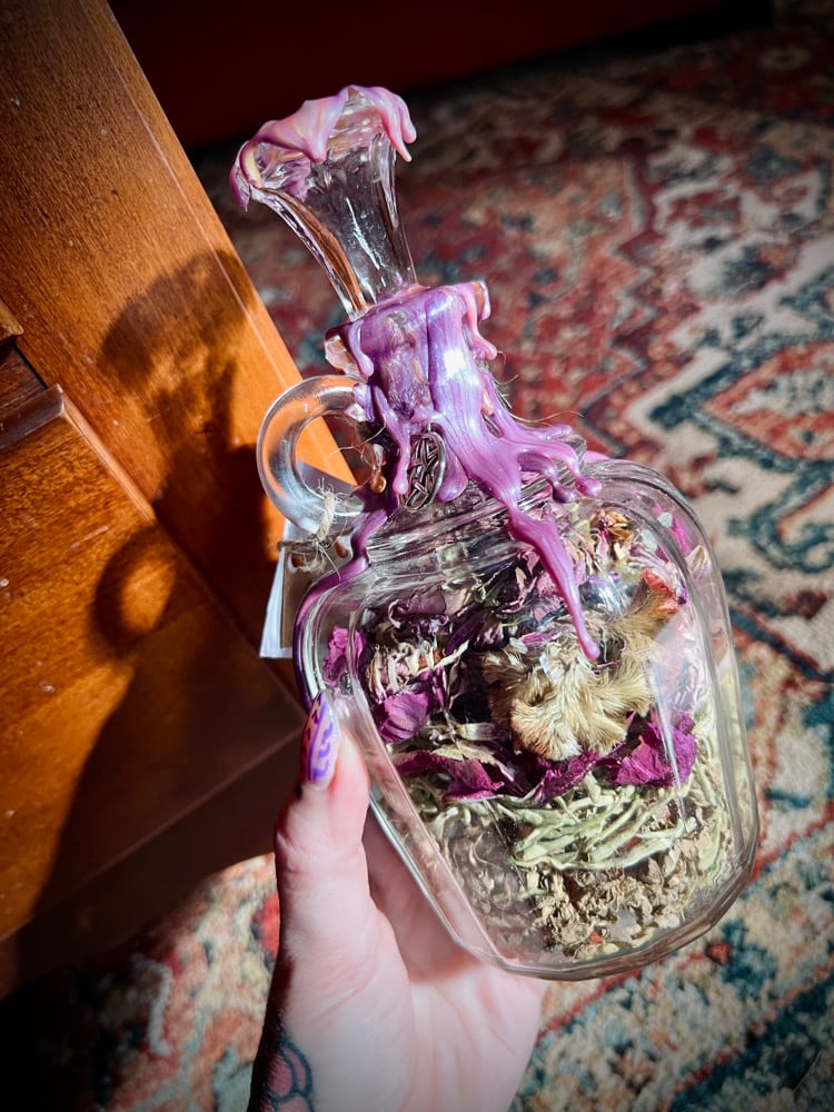 Filled with pink salt, ginger, honeysuckle, peony, zinnia, celosia, dahlia, rose, angelite, strawberry quartz, rhodochrosite and rose quartz.