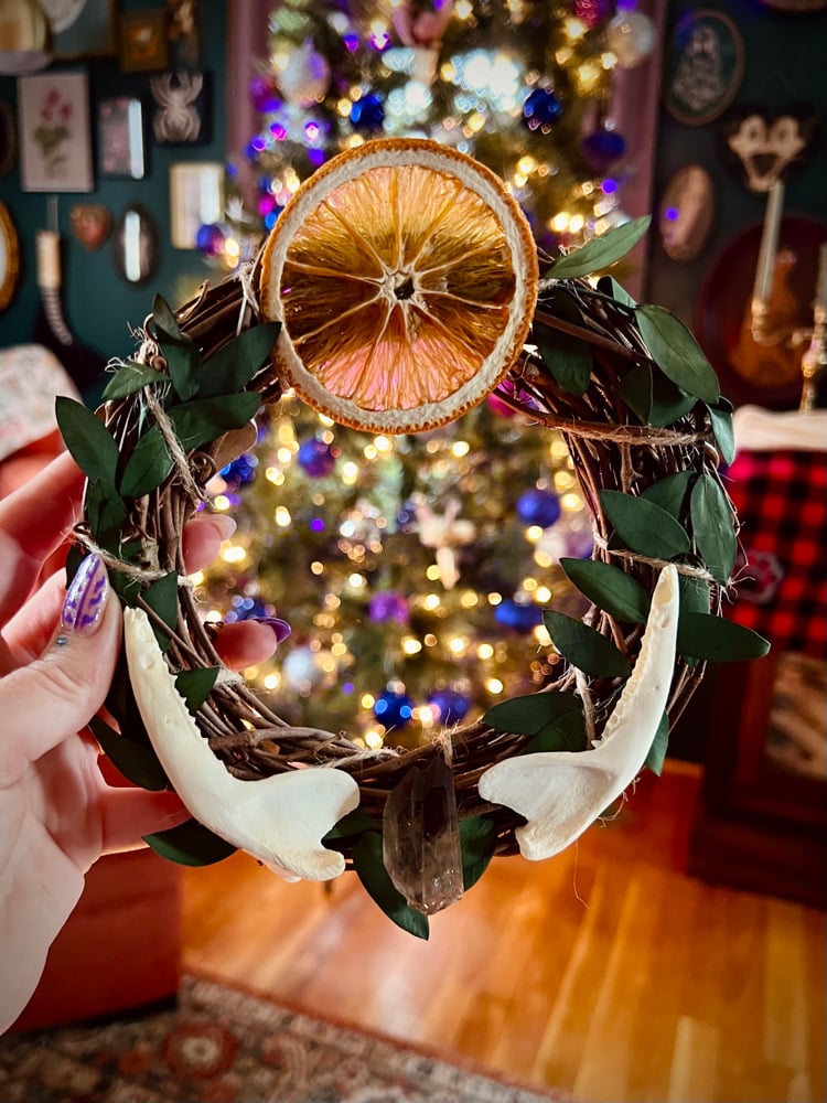 Small wreath adorned with opossum jaw bones, eucalyptus, orange and smokey quartz